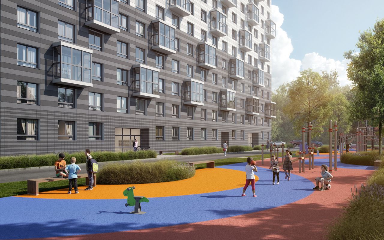 В закрытых дворах, без машин, для детей будут оборудованы детские игровые и спортивные площадки. Для любителей спорта есть площадки для воркаута. Футбольные и баскетбольные площадки расположили за периметром дворов, чтобы не нарушать спокойствие жителей. Вокруг много зелени и территория больше напоминает красивый парк, с организованными местами для прогулок и отдыха. Уже построено два детских сада на 130 и 95 мест, а также небольшая школа на 275 мест.